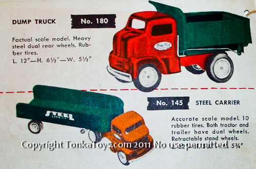 ![]() No 180 Dump Truck factual scale model. Heavy steel dual rear wheels. Rubber tires. 12 inches high, 6 1/2 inches wide, 5 1/2 inches tall. No. 145 Steel Carrier accurate scale model. 10 rubber tires. Both tractor and trailer have dual wheels. Retractable stand wheels. 22 inches long, five and three-quarter inches high, 5 3/4 inches wide. |