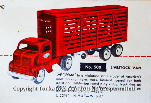 ![]() No. 500 Livestock Van a first-in miniature scale model of America's most popular farm truck. Unusual appeal for both adult and child-top rated play value. Truck tires on plated steel wheels. Full-loading tandem axle on trailer. Locking stand wheels.22 1/2 inches long, 9 1/4 inches high, 6 1/4 inches wide. |
