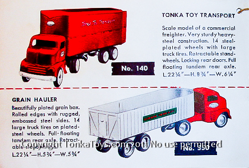 ![]() No. 140 Tonka Toy Transport scale model of the commercial freighter. Very sturdy heavy steel construction. 14 steel plated wheels with large truck tires. Retractable stand wheels. Locking rear doors. Full floating tandem or axle. 22 1/4 inches long, eight in three-quarter inches high, 6 1/4 inches wide. No. 550 Grain Hauler beautifully plated grain box. Rolled edges with rugged embossed teal sides. 14 large truck tires on steel plated wheels. Full floating tandem rear axle. Retractable stand wheels.22 1/4 inches long, five and three-quarter inches high, five and three-quarter inches wide. |