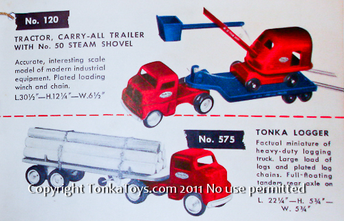 ![]() No. 120 Carry-All Trailer with No. 50 Steam Shovel accurate, interesting scale model of modern industrial equipment. Slated loading winch and chain. 30 1/2 inches long, 12 1/4 inches high, 6 1/2 inches wide. No. 575 Logger factual miniature heavy-duty logging truck. Large load of logs in plated log chains. Full floating tandem or axle on trailer.22 1/4 inches long,5 3/4 inches high, 5 3/4 inches wide. |