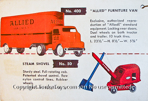 ![]() No 400 "Allied" Furniture Van exclusive, authorized reproduction of Allied's standard equipment. Locking rear doors. Dual wheels on both tractor and trailer. Has 10 truck tires. 23 1/2 inches long, 8 1/2 inches high 5 3/4 inches wide. No. 50 Steam Shovel sturdy steel. Full floating. Patented shovel control. raw nylon control lines. Rubber wheels.20 and three-quarter inches long, and a half inches high, 6 inches wide. |