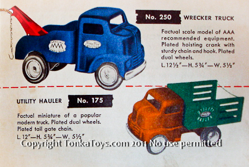 ![]() No. 250 Wrecker Truck factual scale model of AAA recommended equipment. Plated hoisting crank with sturdy chain and hook. Steel plated dual wheels. 12 and half inches long, five and three-quarter inches high, 5 1/2 inches wide. No. 175 Utility Hauler factual miniature of a popular modern truck. Plated dual wheels. Plated tailgate chain. 12 inches long, five and three-quarter inches high, 5 1/2 inches wide. |
