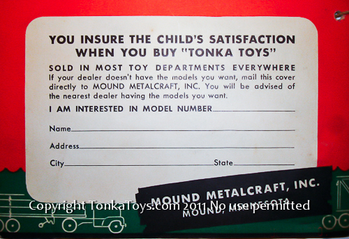 ![]() Back Cover of the 1953 Tonka Toys Look Book which was used as a mail in request for more information about specific models. |