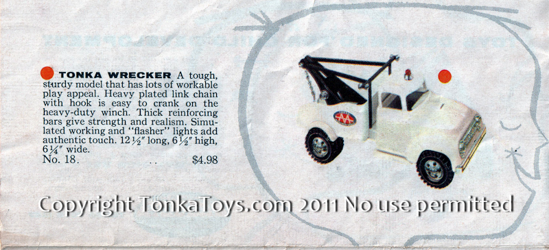 ![]() No. 18 Tonka wrecker a tough, sturdy model that has lots of workable play appeal. Heavy plated leg chain and hook is easy to crank on the heavy-duty winch. Thick reinforcing bars give strength and realism. Simulated working and "flasher" lights add an authentic touch.12 1/2 inches long, 6 1/2 inches high, 6 1/4 inches wide. |