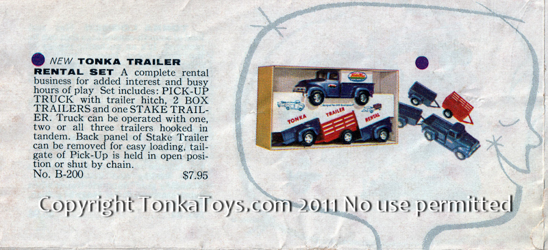 ![]() No. B-204 Tonka truck trailer rental set a really versatile collection of trucks and accessory units. They're completely flexible so that they can be" rented" to perform a variety of hauling tasks for hours of happy play. Set includes: farm state truck with removable panels for carrying oversize loads; pickup truck with movable tailgate in trailer hitch; stake trailer and box trailer. |