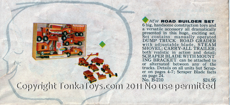 ![]() No. B-210 road builder set Six big, handsome construction toys and a versatile accessory all dramatically presented in this huge, exciting set. Set contains manually operated dump truck, road grader with adjustable blade, steam shovel, carryall trailer, both realistic and action in detail. Scraper blade with mounting bracket can be attached or alternated between any of the trucks. Details on all units on other pages. |