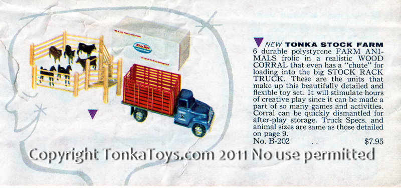 ![]() No. B-202 Tonka stock farm set six durable polystyrene farm animals frolicking realistic would corral that even has a "shoot" for loading into the big stock rack truck.these are the units that make up this beautifully detailed and flexible toys set it will stimulate hours of creative places it can be made a part of so many games and activities. Chorale can be quickly dismantled for after play storage. Truck specifications and animal sizes are the same as those detailed for vehicle number 32. |