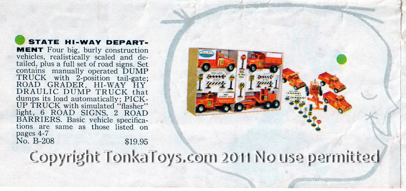 ![]() No. B-208 state hi-way Department set forbade, early construction vehicles, realistically scaled in detailed, plus a full set of road signs. Set contains a manually operated dump truck with two position tailgate; road grader, Highway hydraulic dump truck that dumps his load automatically; pickup truck was simulated " flasher" light, six road signs, two road barriers. basic vehicle specifications are the same as those listed on individual item pages. |