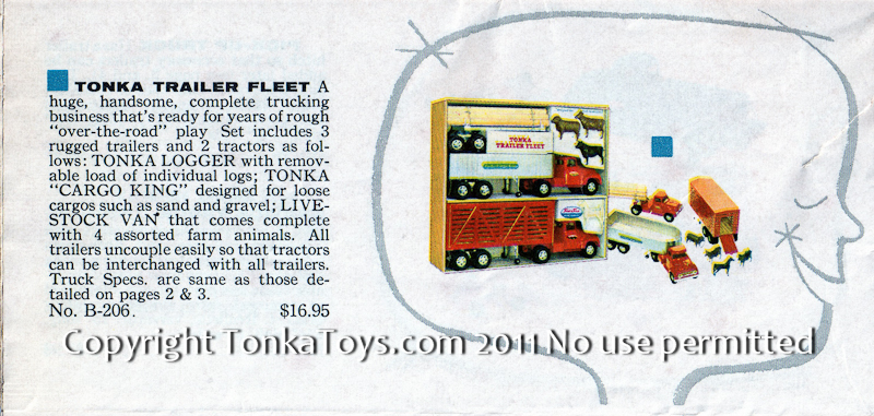 ![]() No. B-206 Tonka trailer fleet set a huge, handsome, complete trucking business that's ready for years of rough" over-the-road" playset includes three rugged trailers and two tractors as follows: Tonka longer with removable load of individual logs: Tonka "Cargo King" designed for loose cargo such as standing gravel; livestock Van that comes complete with four assorted farm animals. All trailers uncouple easily so that tractors can be interchanged with all trailers. Truck specs are the same as those detailed on additional pages. |