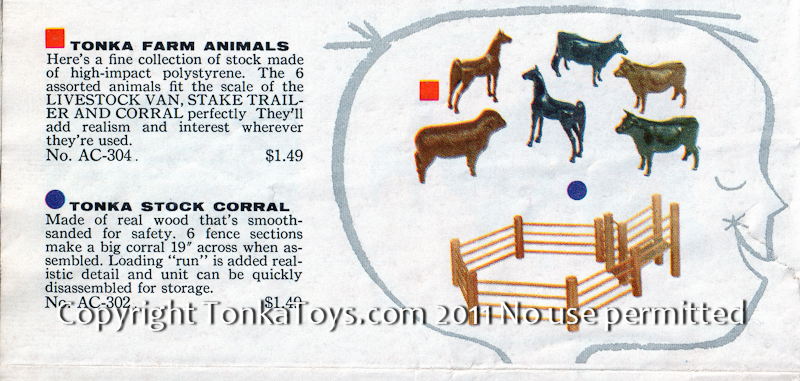 ![]() No. AC-304 Tonka farm animals here's a fine collection of stock made of high impact polystyrene. The six assorted animals fit the scale of the livestock Van, stake trailer and corral. Perfectly. They'll add realism and interest wherever they're used. No. AC-302 Tonka stock corral made of real wood that smooth sanded for safety. Sixpence sections take a big corral 19 inches across when assembled. Loading run is added realistic detail and unit can be quickly disassembled for storage. |