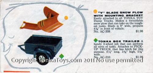 ![]() No. AC-308 "V" blade snowplow with mounting bracket easily attach to all Tonka toy dump trucks. Makes a formidable snowplow that can take on the toughest tasks. Blade is 9 inches wide, projects 4 3/4 inch in front of vehicle. No. AC-310 Tonka box trailer a handy to will job that can perform all sorts of t tasks. Attaches to pickup truck that has hitch for this purpose. 8 1/2 half inches long, three and three-quarter inches high, 5 1/4 inches wide. |