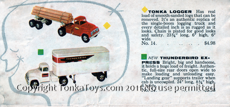 ![]() No. 14 Tonka logger has real load of smooth sanded logs that can be removed. It's a tough replica of the single boom logging truck and every detailed inch as is rugged as it looks. Chain is plated for good looks and safety. 23 and three-quarter inches long, 6 inches high, 6 inches wide. Number 34 Thunderbird express bright big and handsome, it holds a huge load of freight. Authentic, full-size rear doors open wide to make loading and unloading easy." Landing gear" supports trailer when Is uncoupled. 24 inches long, eight in three-quarter inches high, 6 inches wide. |