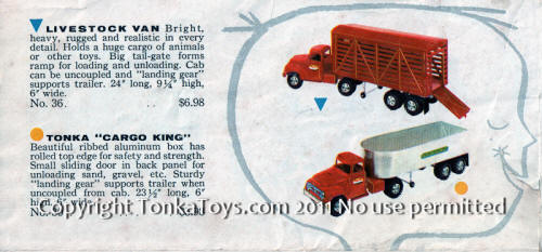 ![]() No. 36 livestock Van Bright, heavy, rugged and realistic in every detail. Holds a huge cargo animals another toys. Big tailgate forms ramp for loading and unloading. Can be coupled and "landing gear" supports trailer. 24 inches long, 9 1/4 inches high, 6 inches wide. No. 30 Tonka cargo King Beautiful ribbed aluminum box has roll top edge for safety and strength. Small sliding door and the back panel for unloading sand, gravel, etc. Sturdy " landing gear" supports trailer when uncoupled from. 23 1/2 inches long, 6 inches high, 6 inches wide. |