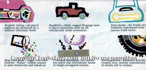 Tonka Toys Look Book from 1957. In 1957 Tonka came out with a huge product line with several new items like the Thunderbird express truck. All trucks had the terrific looking hood scoop, which was only used for one year. | |