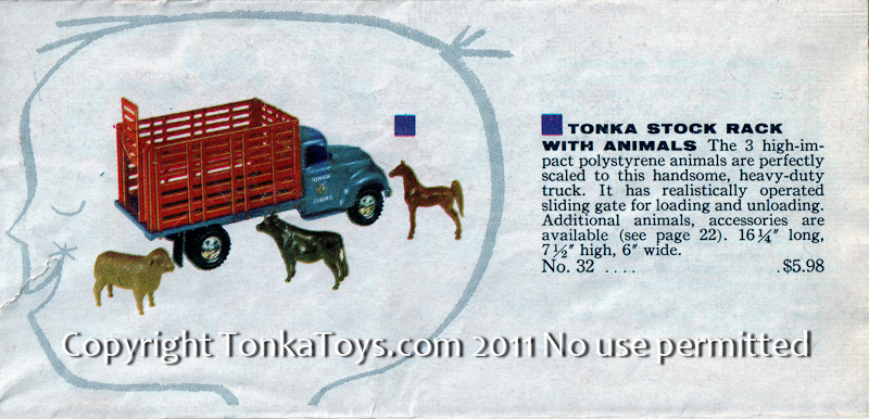![]() NNo 32 Tonka stock rack with animals The three high impact polystyrene animals are perfectly scaled to this handsome, heavy-duty truck. It has realistically operated sliding gate for loading and unloading. Additional animals, accessories are available. 16 1/4 inches long, 7 1/2 inches high, 6 inches wide. |