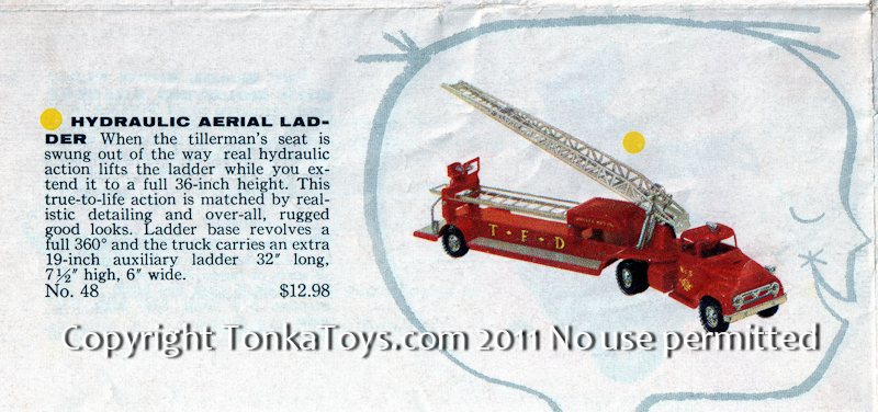 ![]() No. 48 hydraulic aerial ladder truck When the Tillerman's seat is swung out of the way real hydraulic action lifts a ladder while you extended to a full 36 inch height. This true to life action is matched by realistic detailing an overall rugged good looks. Ladder base revolves a full 360° and the truck carries an extra 19 inch auxiliary ladder 32 inches long. Seven a half inches high 6 inches wide. |