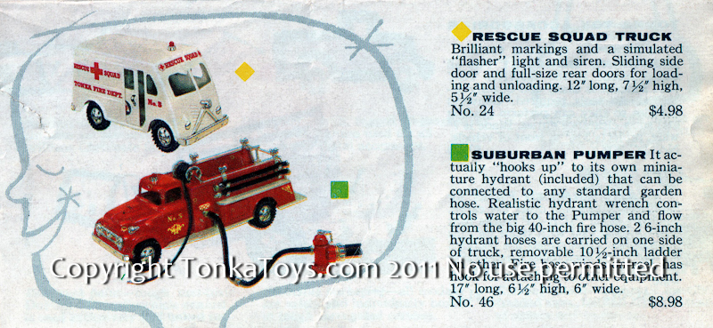 ![]() No. 24 Rescue Squad Truck brilliant markers in a simulated" flasher" light and siren. Sliding side door and full-size rear doors for loading and unloading. 12 inches long, 7 1/2 inches high, 5 1/2 inches wide. No. 46 Suburban Pumper it actually" hooks up" to its own miniature hydrant ( included) that can be connected to any standard garden hose. Realistic hydrant wrench controls water to the pumper and flow from the big forty inch fire hose. Two six-inch hydrant hoses are carried on one side of the truck. removable 10 a half-inch ladder on the other fire hose winds on reel, has hook for attaching to other equipment. 17 inches long, 6 1/2 inches high, 6 inches wide. |