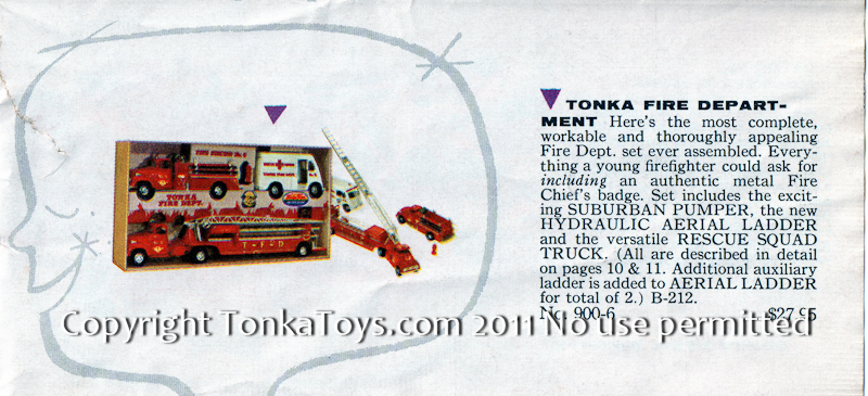 ![]() No B-212 Tonka fire Department set here's the most complete, workable and thoroughly appealing fire Department set ever assembled. Everything a young firefighter could ask for including an authentic metal fire chiefs badge. Set includes the exciting suburban pumper, the new hydraulic aerial ladder and versatile rescue squad truck. Additional auxiliary ladder is added to the aerial ladder for total of two. |