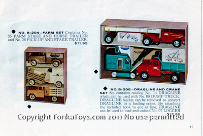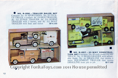 ![]() contains no. 06 sportsman, no. 02 pick-up truck, for trailers: AC 314 horse trailer AC 310 box trailer AC 312 stake trailer and AC 3110 trailer with boat and motor. no. B-207 hi-way construction set contains no. 06 scale model dump truck, no. 12 road grader with adjustable blade; no. 44 dragline that moves for ways; equipment trailer that moves dragline from job to job.  |