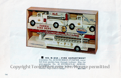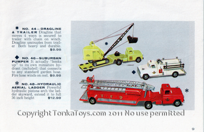 ![]() No. 44 Dragline and Trailer dragline that moves for ways is secured to trailer with chain on winch. Dragline on couples from trailer. Both heavy and durable. No. 46 Suburban Pumper it actually looks up to its own miniature hydrant which is included. Connects to in any standard garden hose. Fire hose winds up on reel. Note: 1959 is the only year Tonka produced white colored fire trucks. These came in either the 1959 Tonka B-212 fire Department set, or the single sale number 46 Suburban Pumper. No. 48 Hydraulic Aerial Ladder Truck powerful hydraulic pistons arch the latter skyward, extended to full 36 inch height.  |