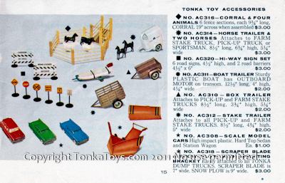 ![]() no. AC 316 Corral and 4 Animals six fence sections, each night in three-quarter inches long, corral 19 inches across when assembled. No. AC 314 horse trailer and two horses attaches to farm state truck, pickup truck or sportsman. 8 1/2 inches long, six in three-quarter inches high, 5 1/4 inches wide. No. AC 320 Hi-Way Sign Set six road signs, 40 half inches high, and two road barriers 4 1/2 by 6 inches high. No. AC 311 boat Trailer sturdy plastic boat has outboard motor on transom. 12 1/2 inches long, or4nches high, 4 1/4 inches wide. no. AC 310 Box Trailer attaches to pick up and farm state truck's. No. AC 312 Stake Trailer attaches to all pickup and farm stake trucks. No. AC 308 Scale Model Cars high impact plastic. Hardtop sedan and station wagon. No. AC 318 Scraper Blade and Snowplow with Mounting Bracket easily attached to all Tonka dump truck's. Scraper blade is 7 inches wide. Snowplow is 9 inches wide.  |