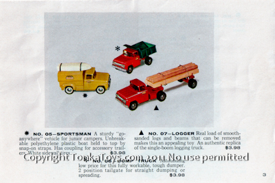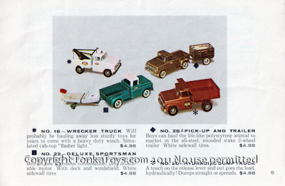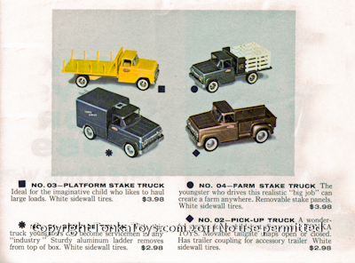 ![]() Ideal for the imaginative child who likes to haul large loads. White sidewall tires. No. 04-Farm State Truck The youngster who drives this realistic big job can creative form anywhere. Removable state panels. White sidewall tires. No. 02 Pickup Truck A Wonderful Starter for Child Just Discovering Tonka Toys. Movable tailgate snaps open or closed. Has trailer coupling for accessory trailer. White sidewall tires. No. 01 Service Truck With this truck youngsters can become servicemen in any industry. Sturdy aluminum ladder removes from top of box. White sidewall tires.  |