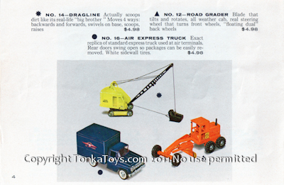 ![]() No. 14 Dragline Actually scoops dirt like it's real life big brother. Moves four ways. Backwards and forwards swivels on base scoops raises. No. 12 Road Grader Blade that tilts and rotates, all weather, real steering wheel the terms of front wheels, floating dual back wheels. No 16 Air Express Truck Exact replica of standard express truck used it air terminals. Rear door swing open so packages can be easily removed. White sidewall tires.  |