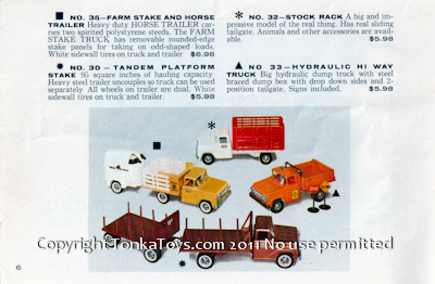![]() no. 35 Farm Stake and Horse Trailer heavy-duty horse trailer carries two spirited polystyrene steeds. The farm state truck, has removable round edge state panels for taking on odd shaped loads. White sidewall tires on truck and trailer. No. 32 Stock Rack a big and impressive model of the real thing. Has real sliding tailgate. Animals and other accessories are available. No. 30 Tandem Platform Stake Truck 95 square inch of hauling capacity. Heavy steel trailer uncouple so truck can be used separately. All wheels on trailer are dual. White sidewall tires on truck and trailer. No. 33 Hydraulic Hi-Way Truck big hydraulic dump truck we steel braised dump box with drop-down sides into position tailgate. Signs included.  |