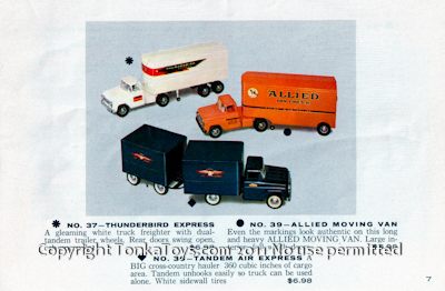 ![]() No. 37 Thunderbird Express a gleaming white freighter with dual tandem trailer wheels. Rear doors swing open, On couples. No. 39 Allied Moving Van even the markings look authentic on this long and heavy Allied moving van. Large interior with full width doors No. 36 Tandem Air Express big cross-country hauler 360 in.³ of cargo area. Tandem unhooks easily so truck can be used alone. White sidewall tires  |