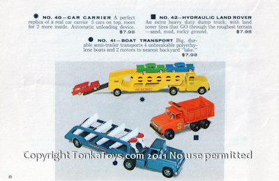 ![]() No. 40 Car Carrier a perfect replica of a real car carrier three cars on top, room for two more inside. Automatic unloading device. No. 42 Hydraulic Land Rover an extra heavy-duty dump truck, with Land Rover tires they go through the toughest terrain. Sand, mud, rocky ground. Note: this is a tough truck to find and I am interested in buying any number 42 hydraulic Land Rover. No. 41 Boat Transport big durable semi trailer transports for unbreakable polyethylene boats and two motors to nearest backyard lake.  |