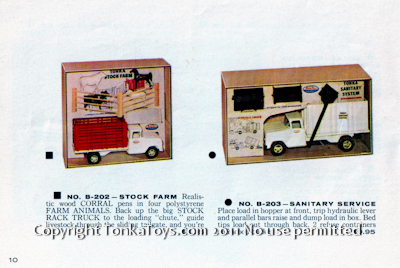 ![]() realistic wood corral pens in for polystyrene farm animals. Back up the big stock rack truck to the loading chute guide livestock through the slide. no. B-203 Sanitary Service Truck place loading hopper at front, trip hydraulic lever and parallel bars raised the dump load inbox. Bed tips loadout through back. To refuse containers included.  |